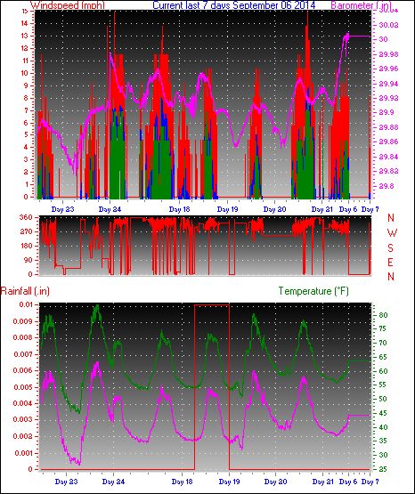 Maximum windspeed = 4.6 mph from 293°(WNW) on day 06 at time 23:59